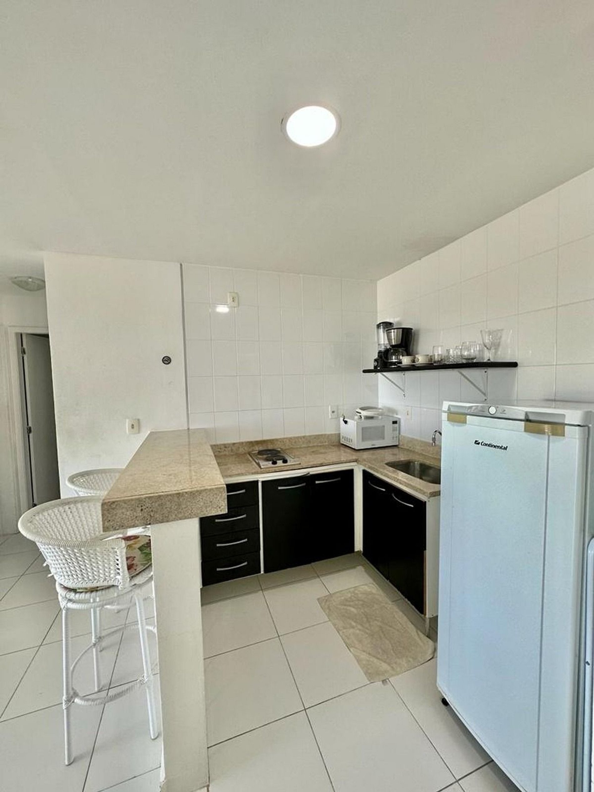 Cozinha: com alguns utensílios, cafeteira e bancada americana + cook top elétrico 2 bocas e micro ondas.