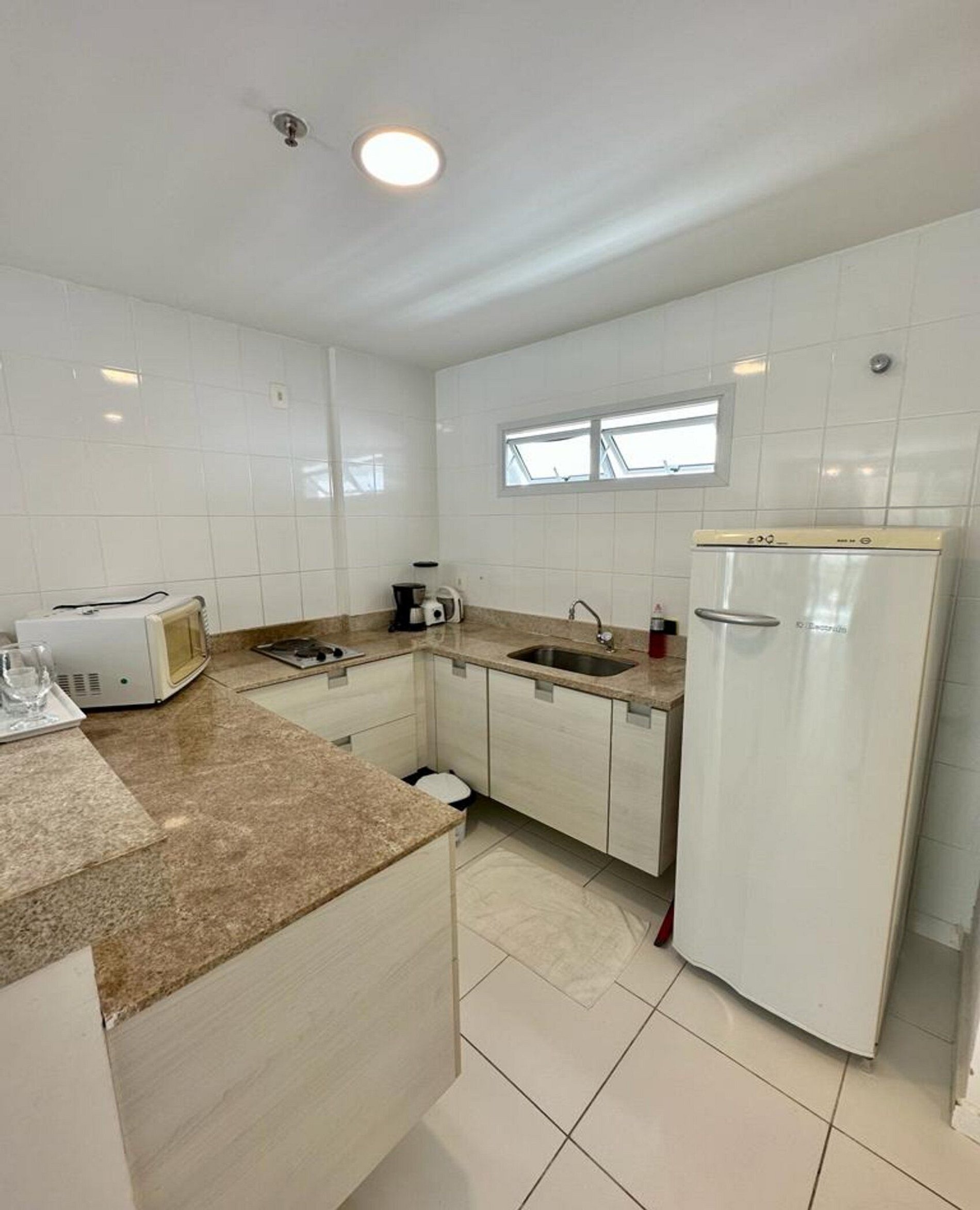 Cozinha: com alguns utensílios, cafeteira e bancada americana + cook top elétrico 2 bocas e microondas.