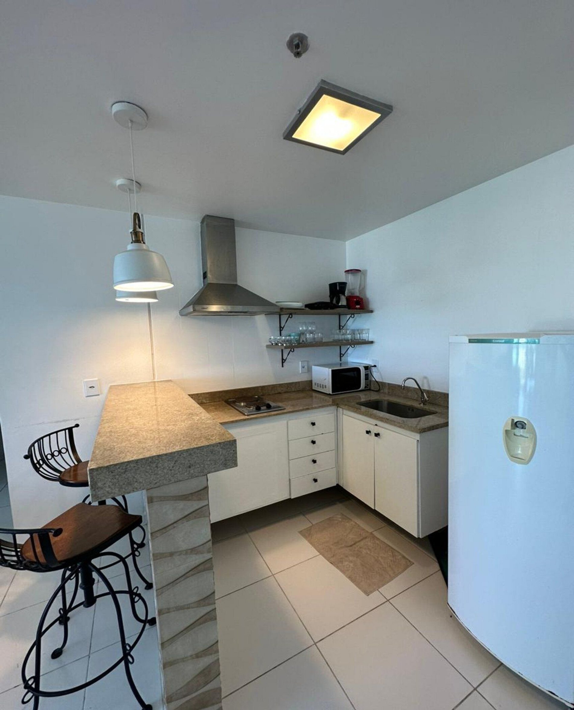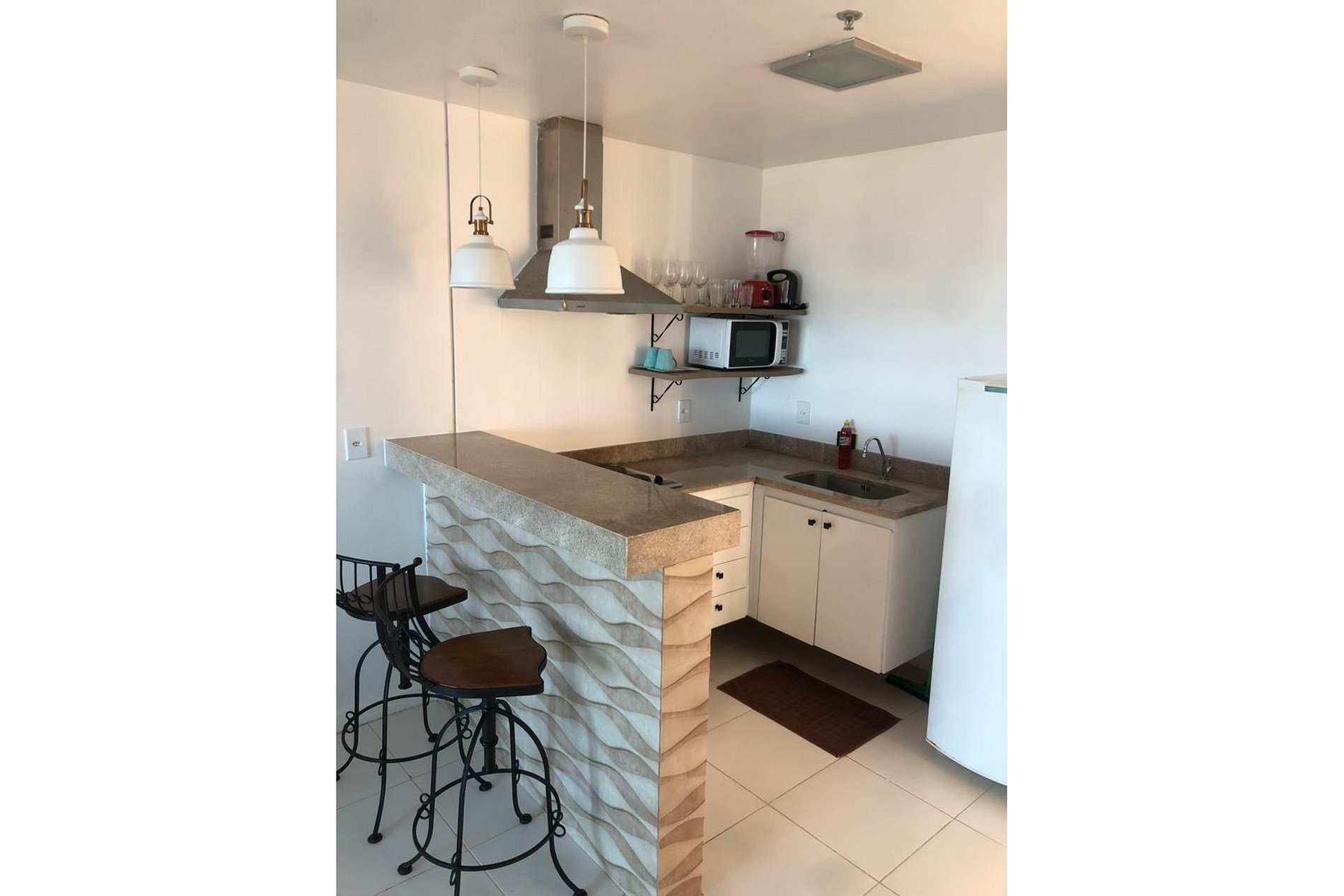 Cozinha: com alguns utensílios, cafeteira e bancada americana + cook top elétrico 2 bocas e micro ondas.